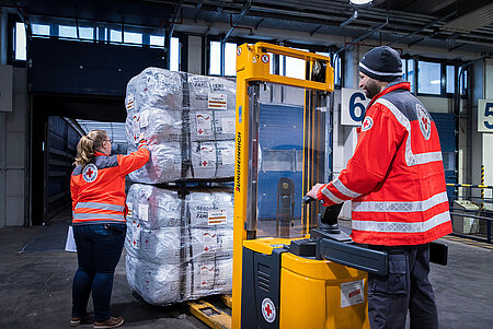 Eine Frau und ein Mann in Einsatzkleidung des Roten Kreuzes verladen Hilfsgüter mit einem Gabelstapler.