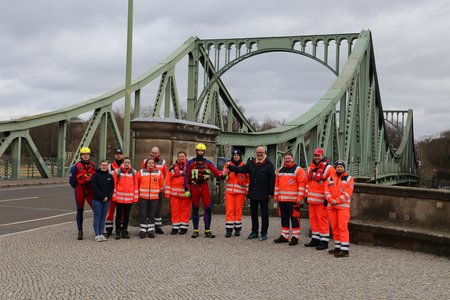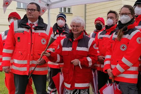 Mit ordentlich Sturmwind im Rücken erreichte das "Licht der Hoffnung" am Samstag, den 19. Februar, Potsdam. Einen geschichtsträchtigeren Übergabeort zwischen dem DRK-Landesverband Berlin e. V. und dem DRK-Landesverband Brandenburg hätte es wohl kaum geben können: An der Glienicker Brücke, an der sich 1990 zum ersten Mal Vertreter des Berliner und Brandenburger Roten Kreuz nach der Wende trafen, nahm die Delegation des DRK-Landesverband Brandenburg die DRK-Fackel entgegen.