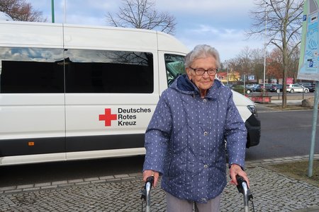 Seit dem Start der Impfzentren in Brandenburg fahren die Fahrdienste der DRK-Kreisverbände Brandenburgerinnen und Brandenburger zu ihrem Impftermin. Wie froh sie sie damit machen, hat nun auch die 101-jährige Irene Buchholz aus Caputh erfahren.