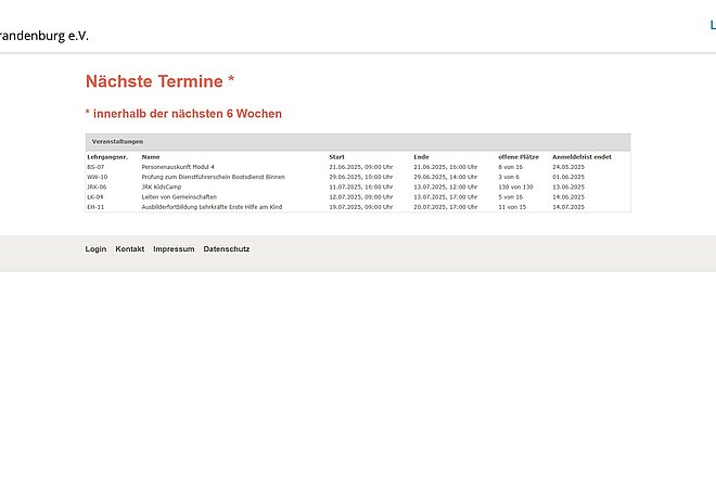 Unseren DRK-Kreisverbänden im Land Brandenburg steht über eine separate Website die Möglichkeit zur Verfügung, Teilnehmende für unsere (Bildungs-)Veranstaltungen über ein Online-Portal anzumelden. Hierfür wird eine Zugangsberechtigung benötigt.
